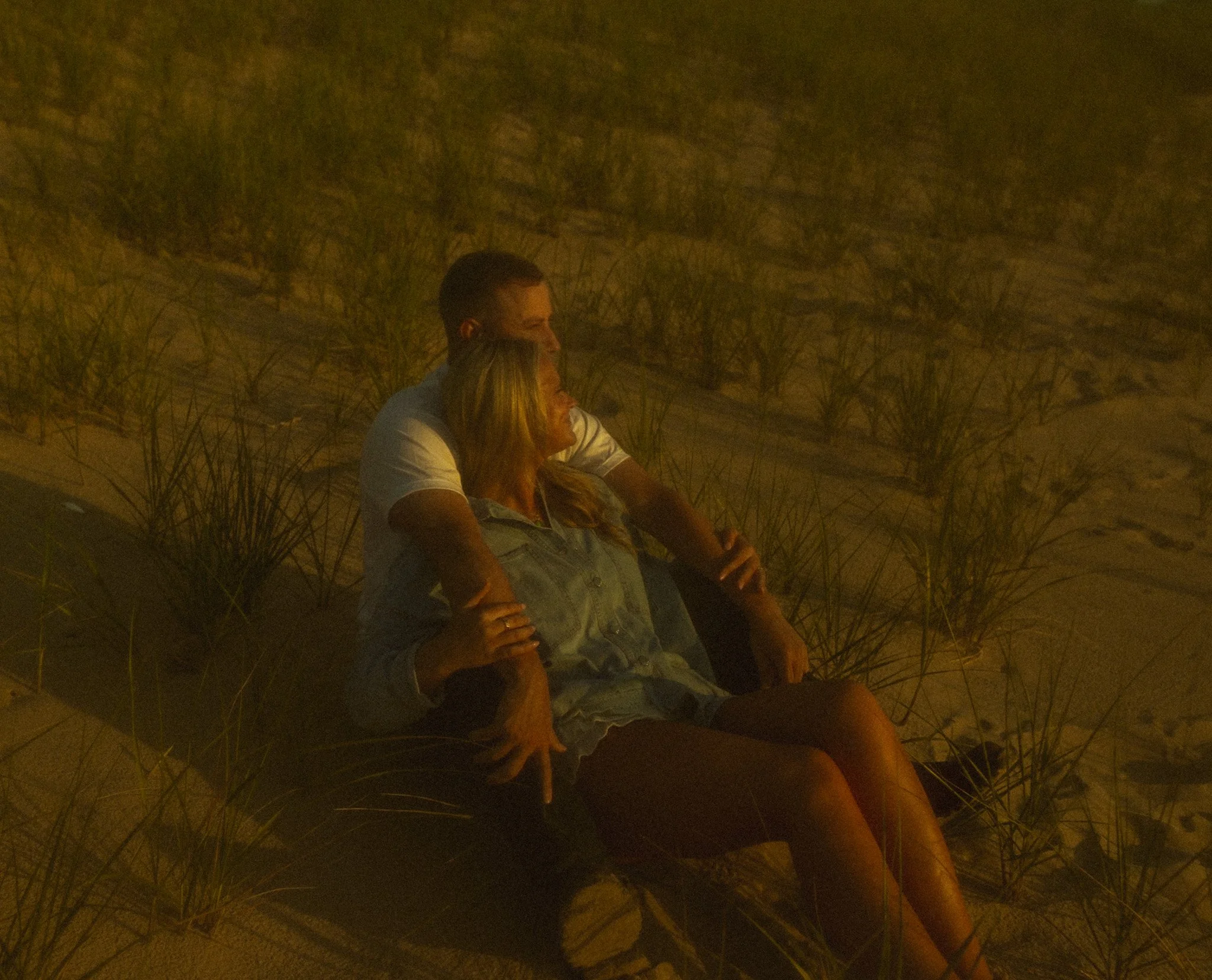 A couple sitting on the sand at a beach during sunset, embracing each other and gazing into the distance.