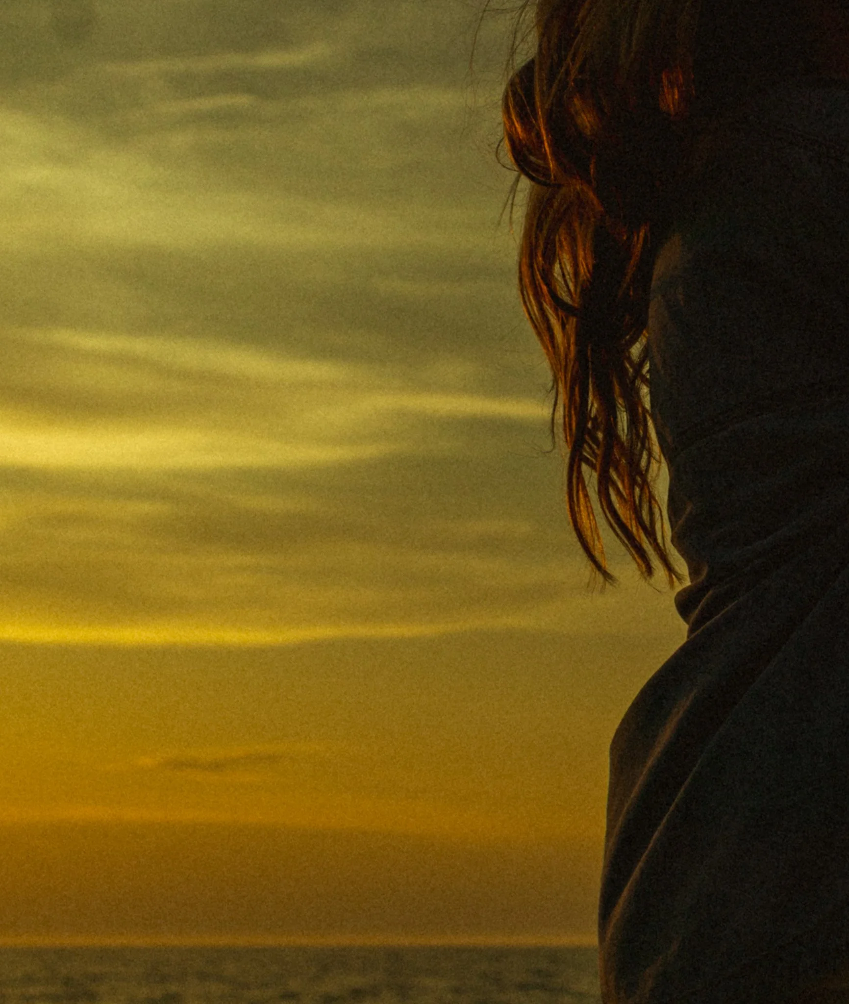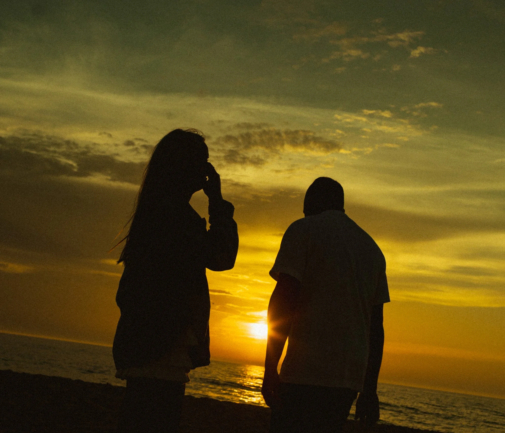 Silhouettes of two people near the sea at sunset, with one person resting on their hand and the other standing, both partially visible.