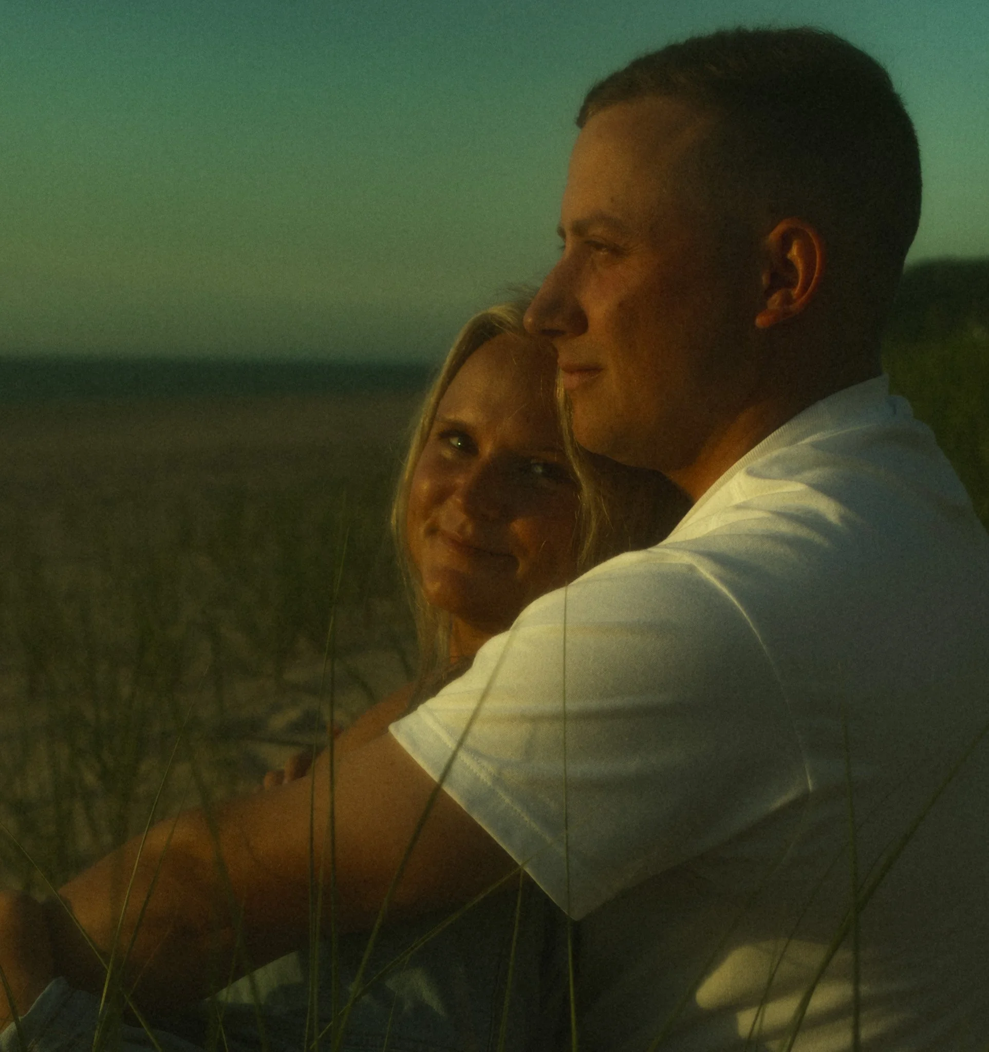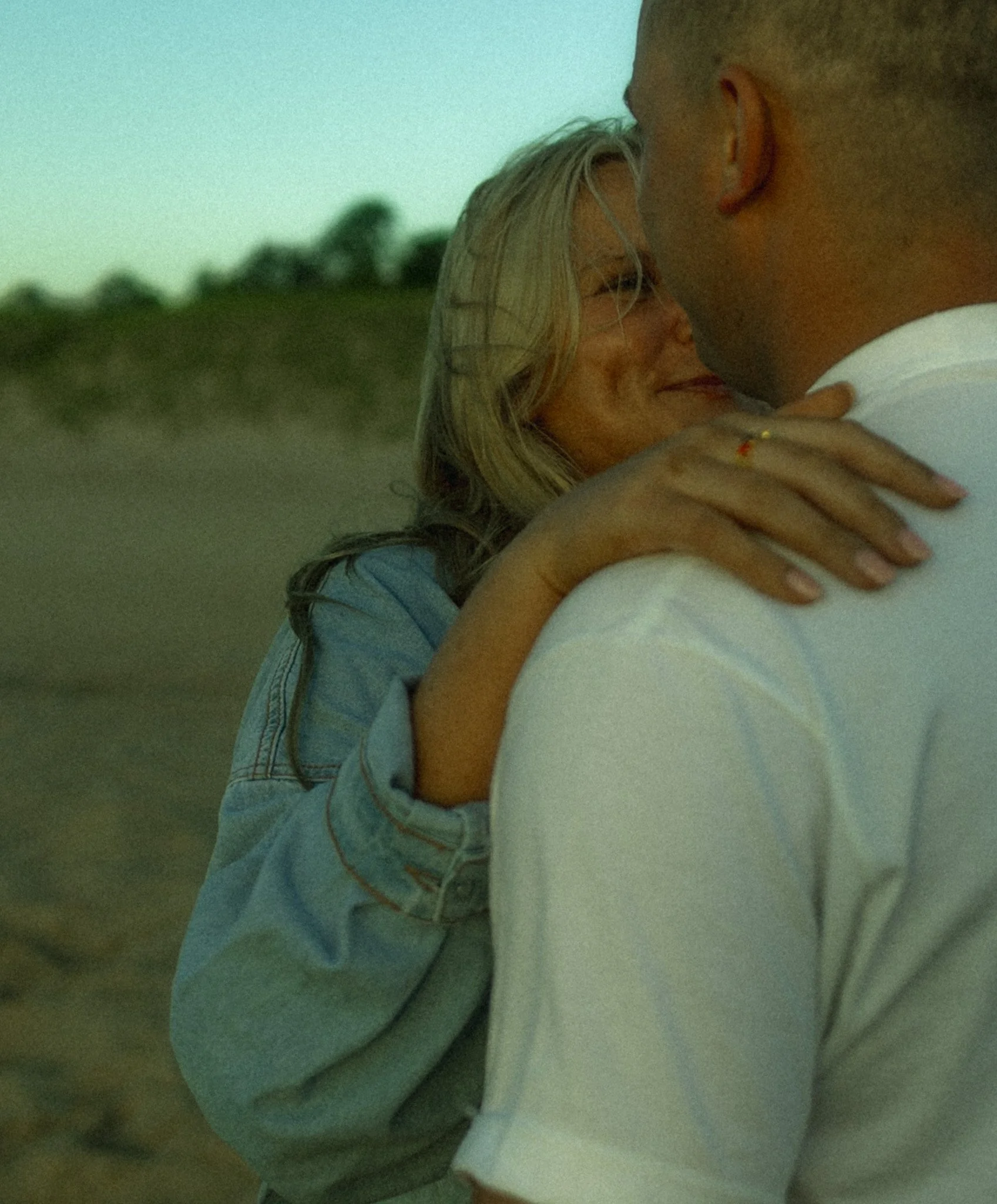 A woman and a man embrace on a beach at sunset, with the woman smiling and the woman holding onto the man's shoulder.