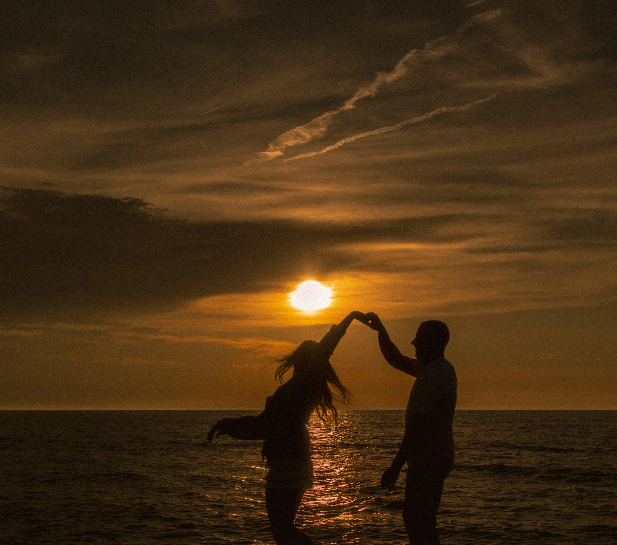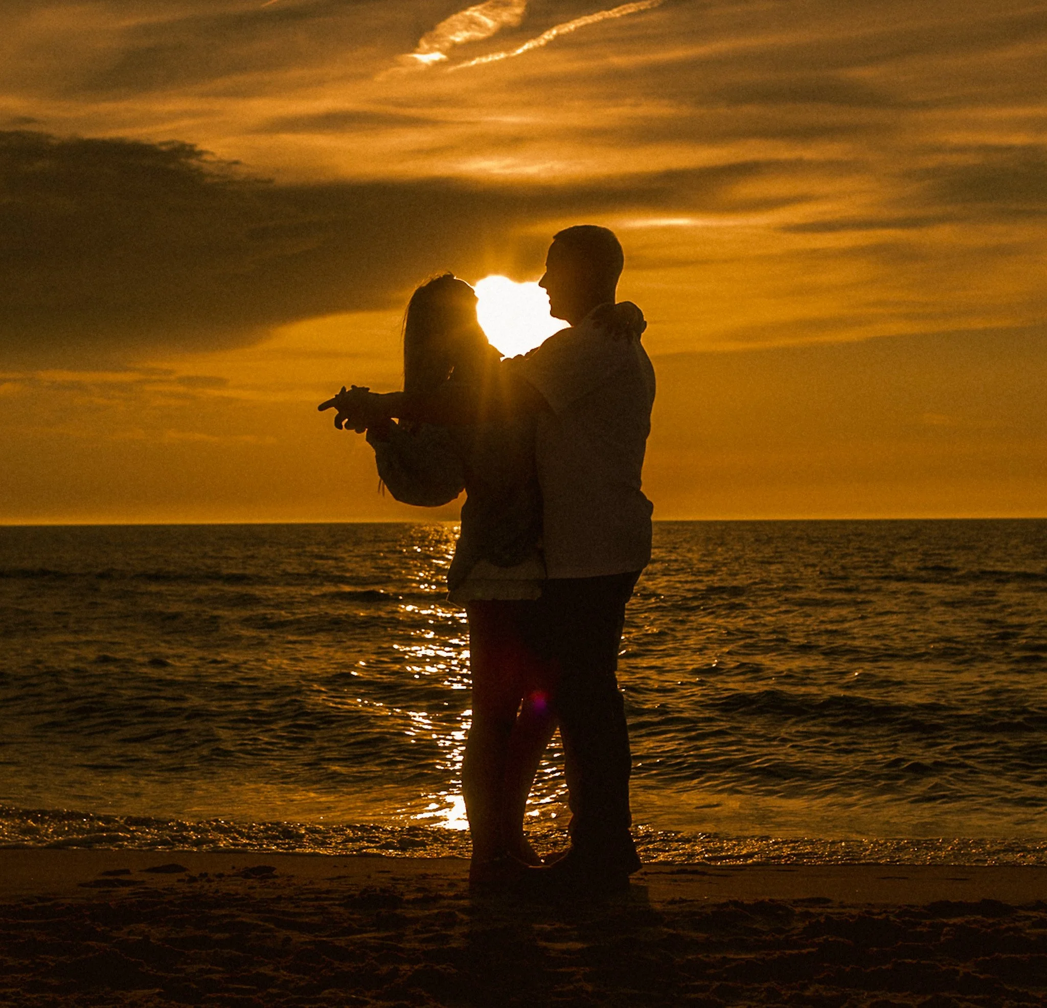 Silhouette of a couple embracing on a beach at sunset, with the sun setting over the ocean in the background.
