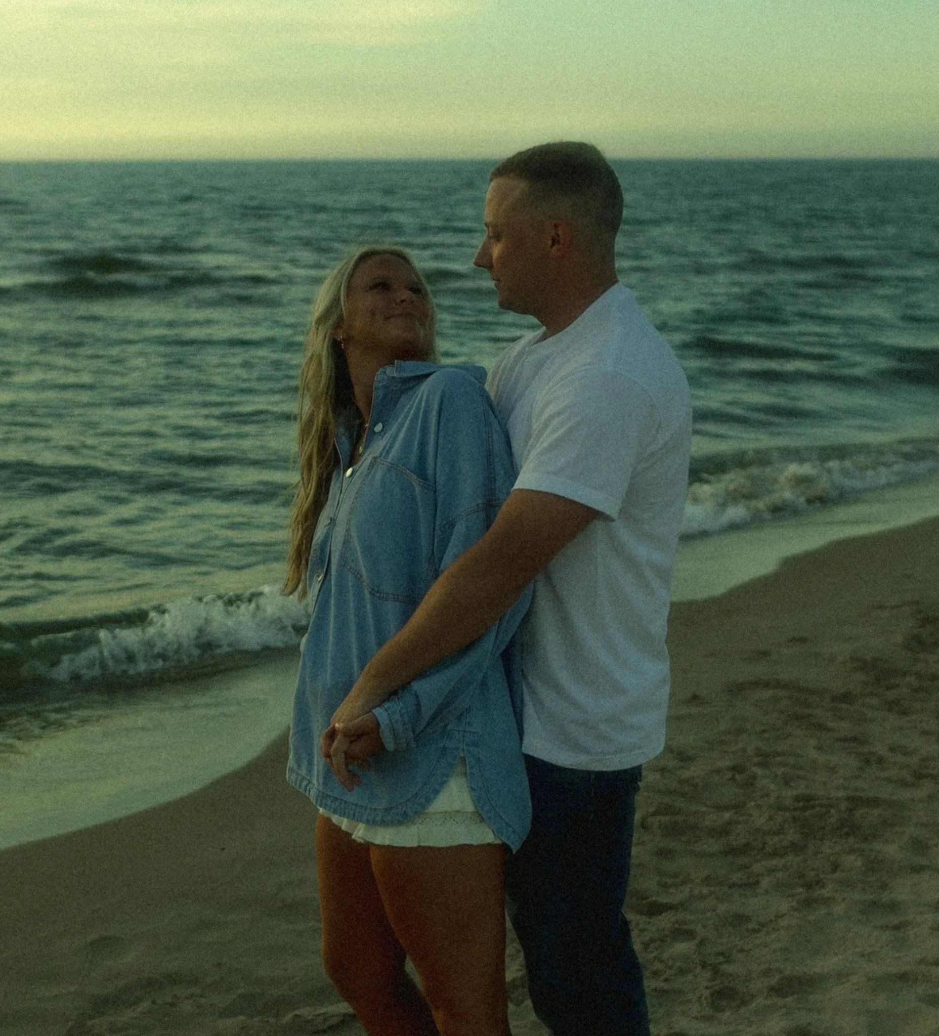 A man and woman hugging by the ocean during sunset, with waves and the horizon in the background.