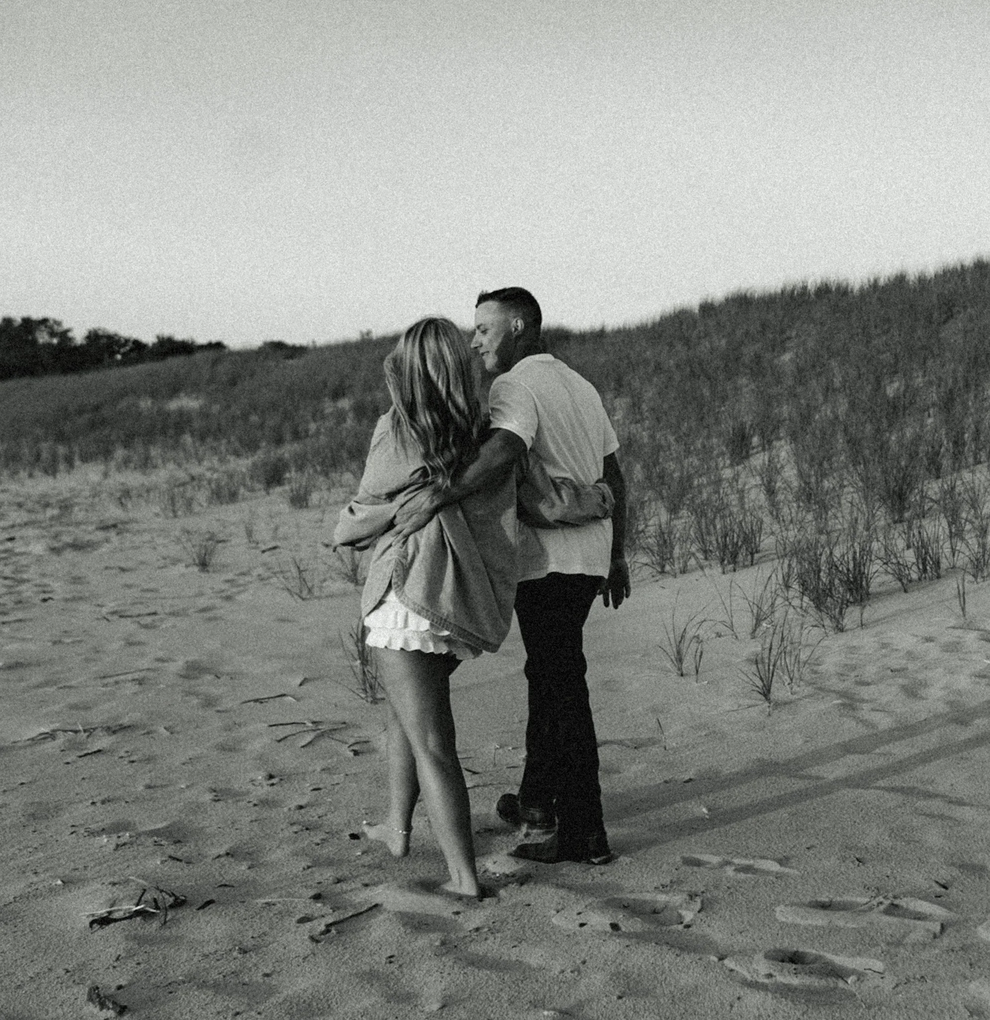 A black and white photo of a young couple embracing and smiling on a sandy beach with dunes and sparse vegetation, during sunset or dusk.