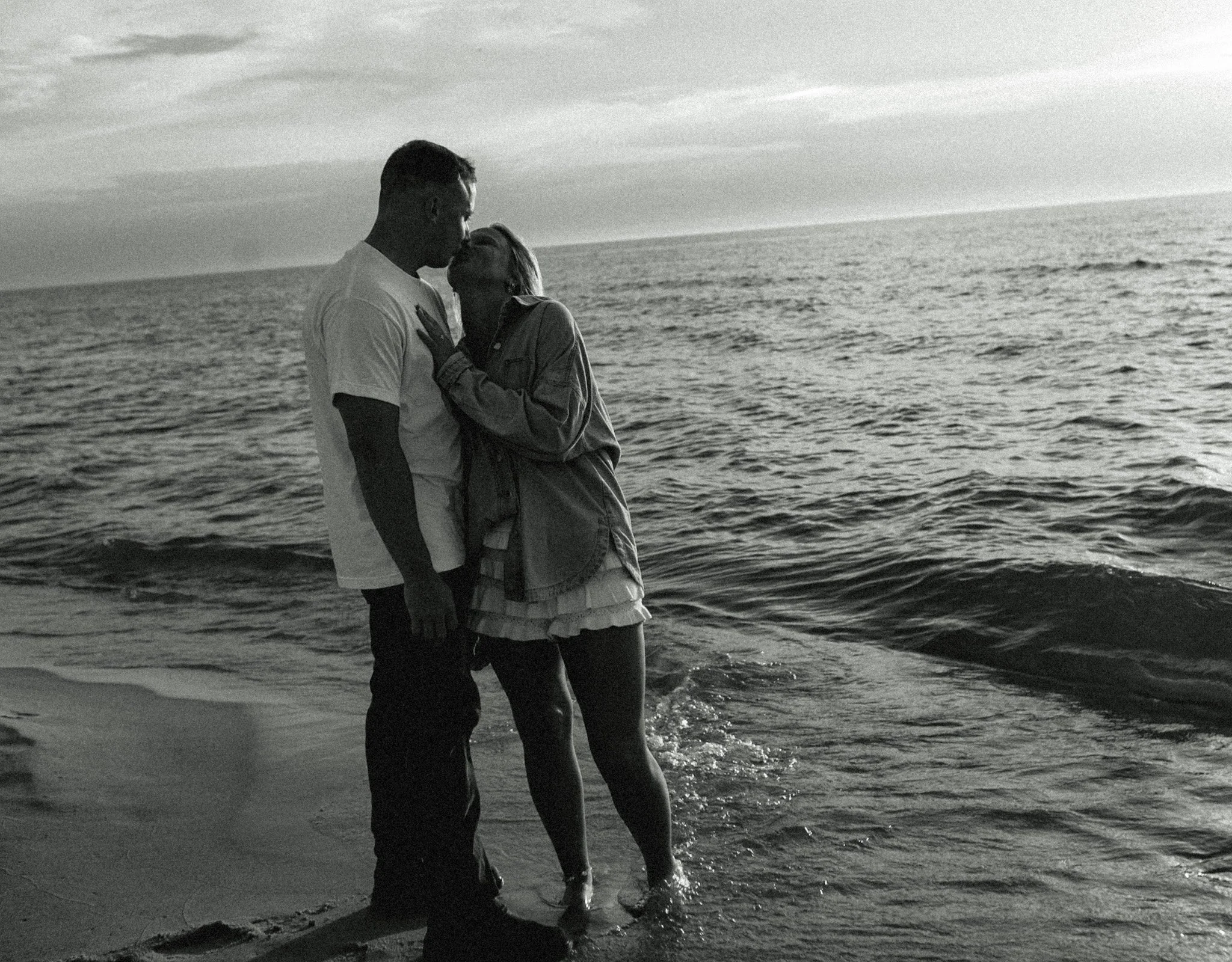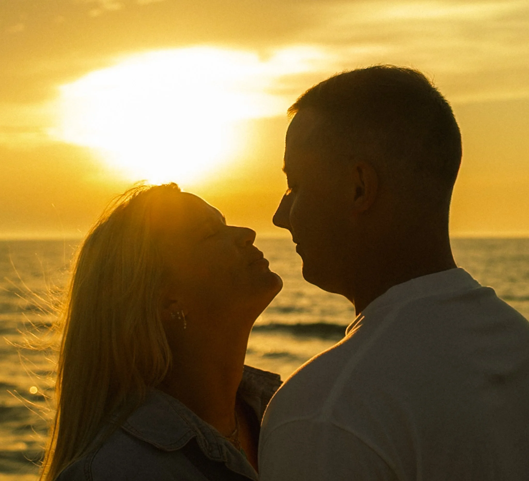 A couple standing on the beach at sunset, embracing and kissing by the ocean