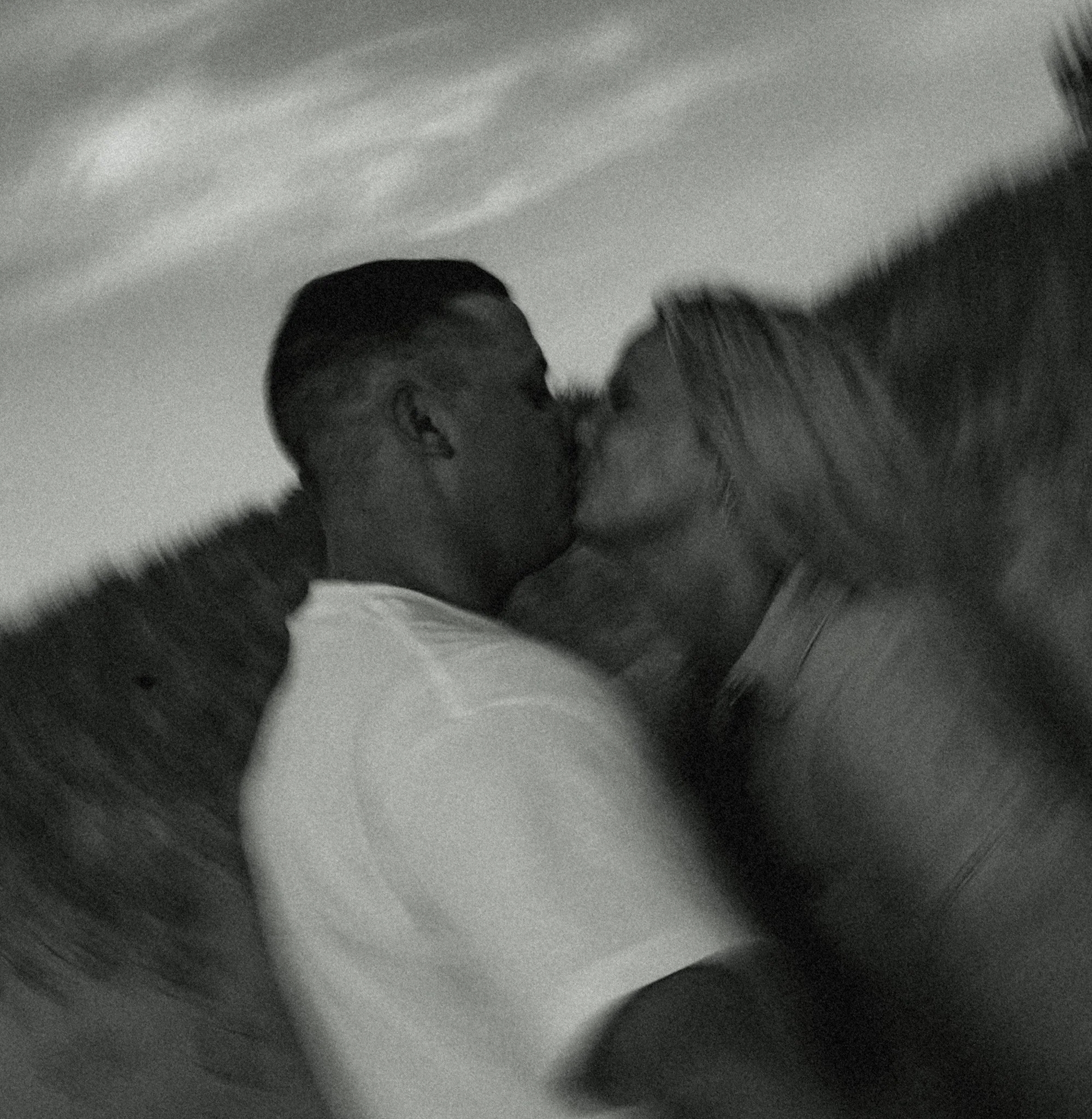 A black and white photo of a man and woman kissing outdoors at sunset.