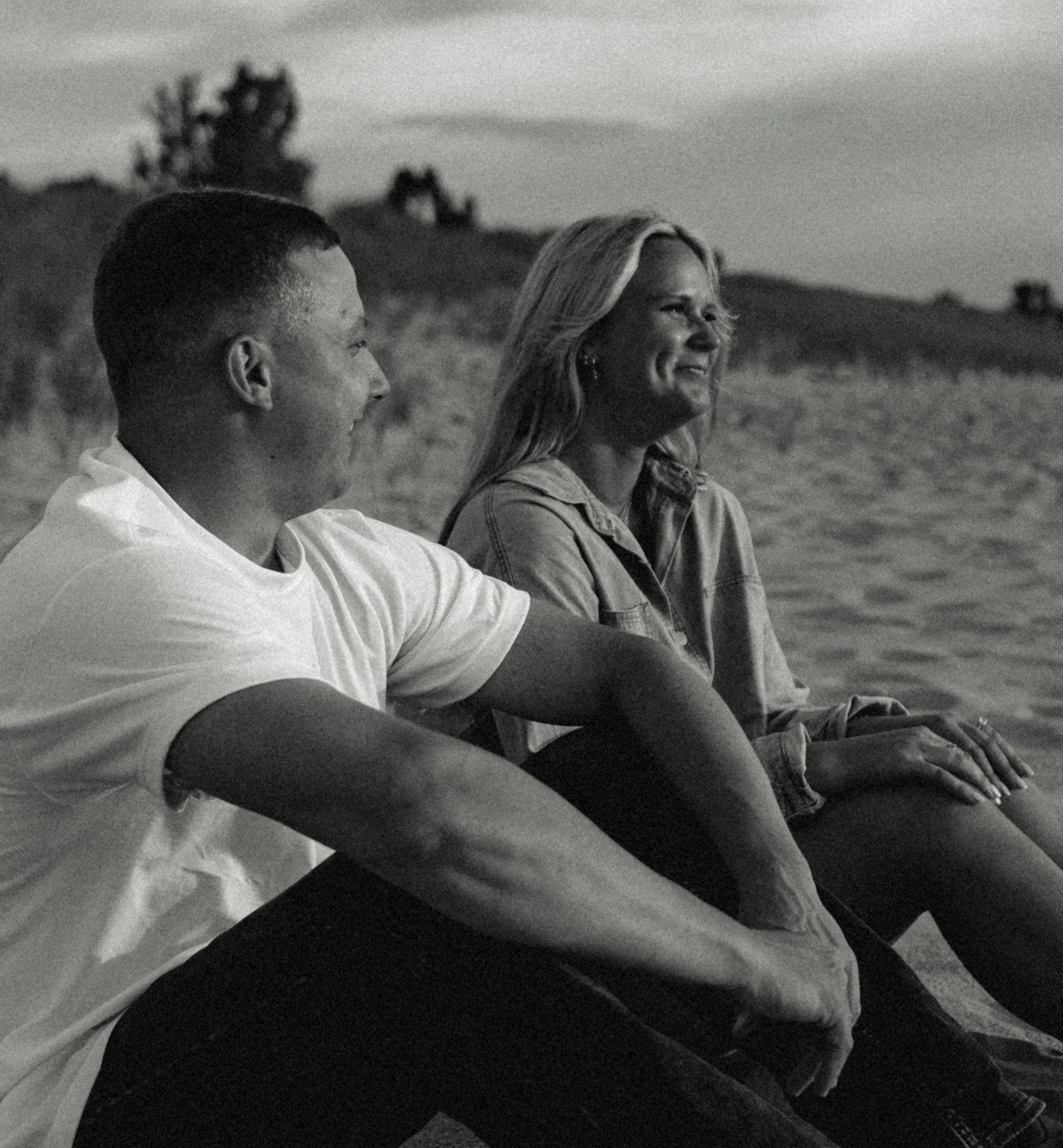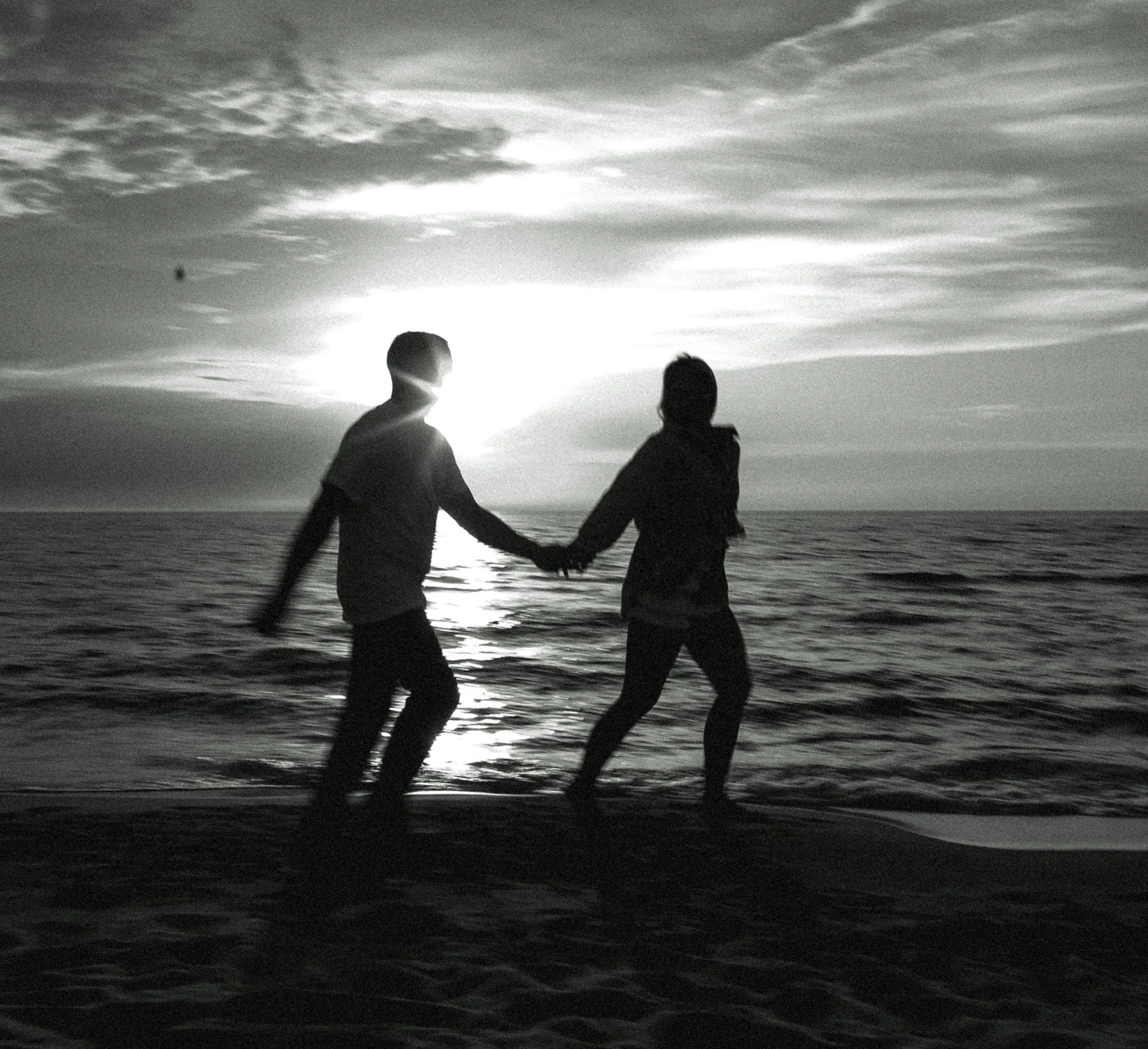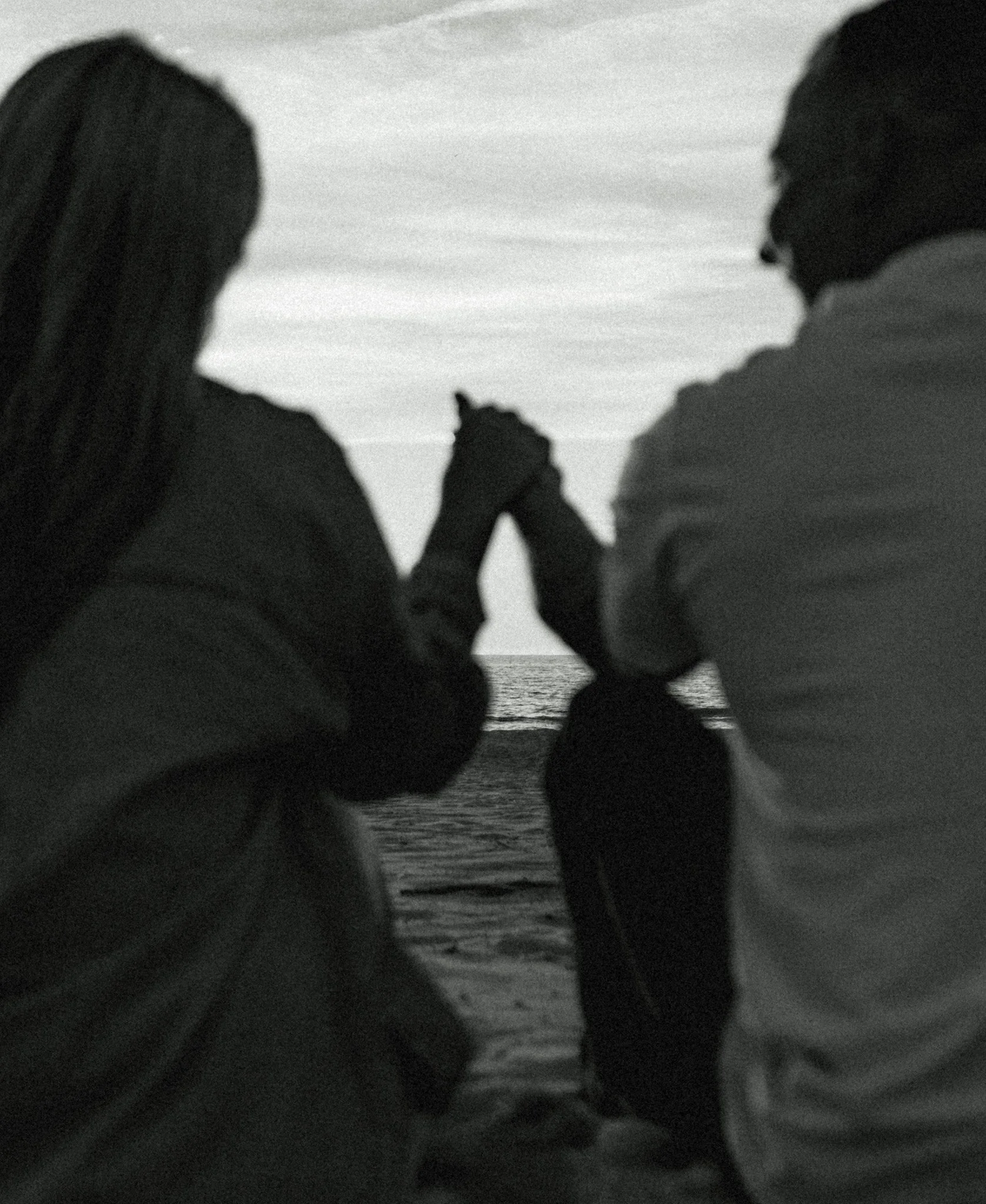 A black-and-white photo of a couple sitting on the beach, holding hands in a heartbeat gesture, facing the ocean at sunset.