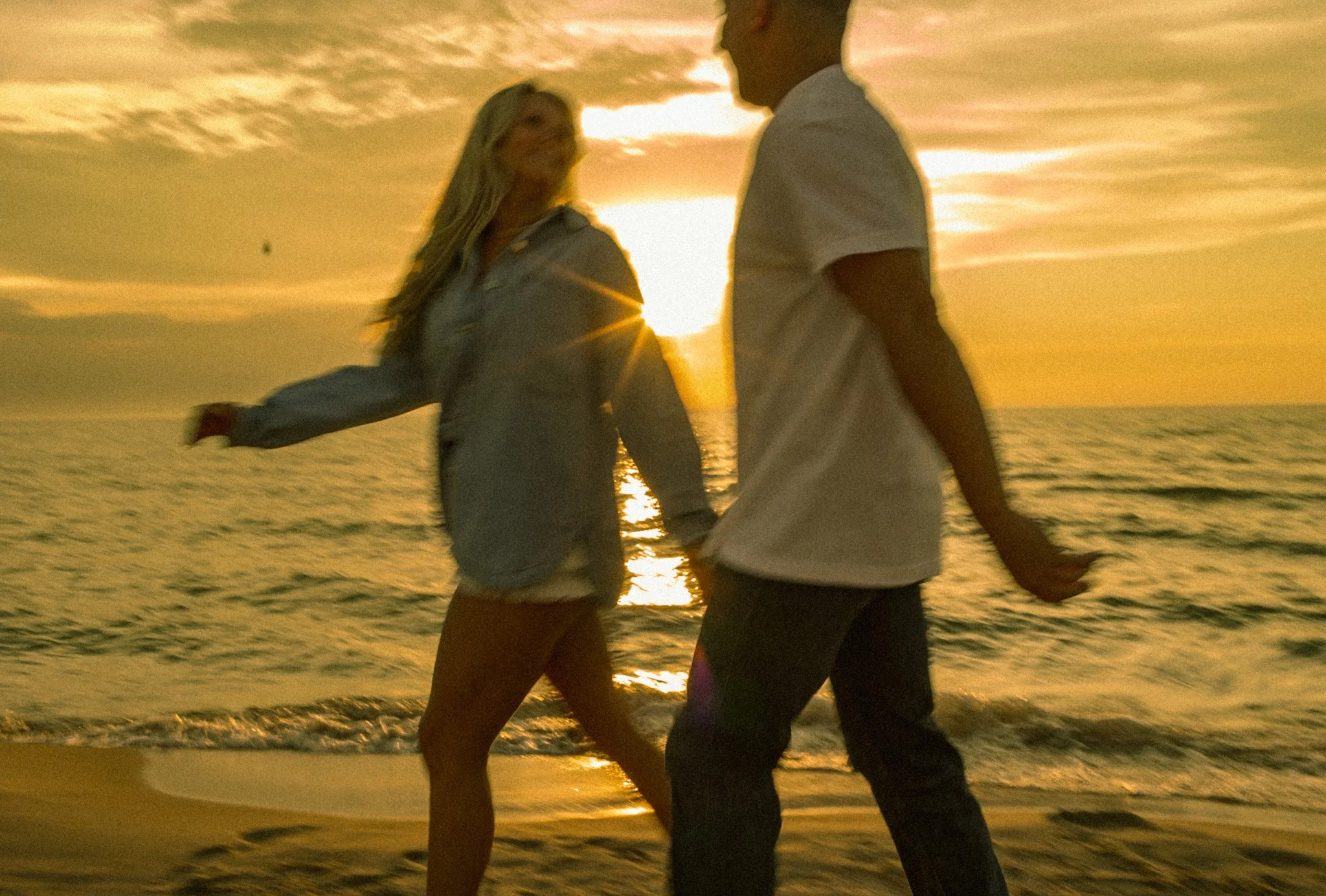 A couple holding hands on a beach during sunset, with the woman having long red hair, wearing a white blouse and jeans, and the man with short brown hair in a dark T-shirt.