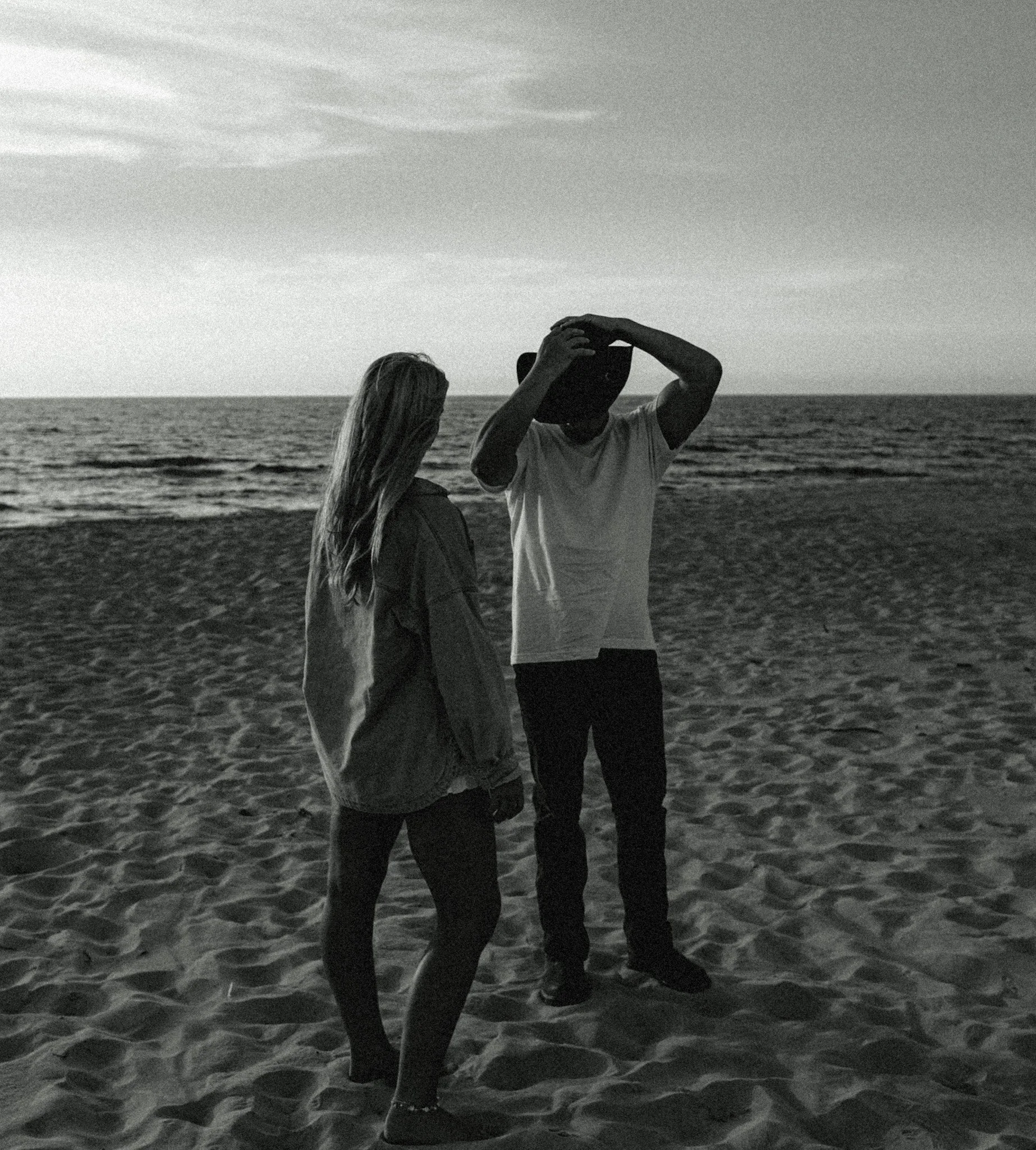A black and white photo of a man and woman on a beach. The man is holding a hat over his face, and the woman is standing nearby facing him, with the ocean and a cloudy sky in the background.