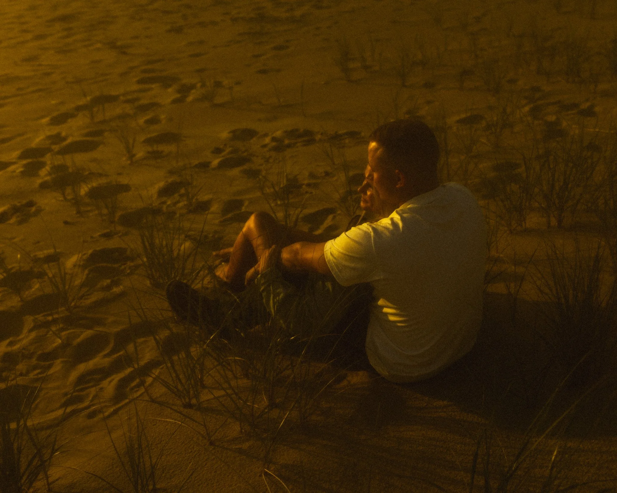 A man sitting on a sand dune at night, surrounded by sparse vegetation, illuminated by warm yellow light.