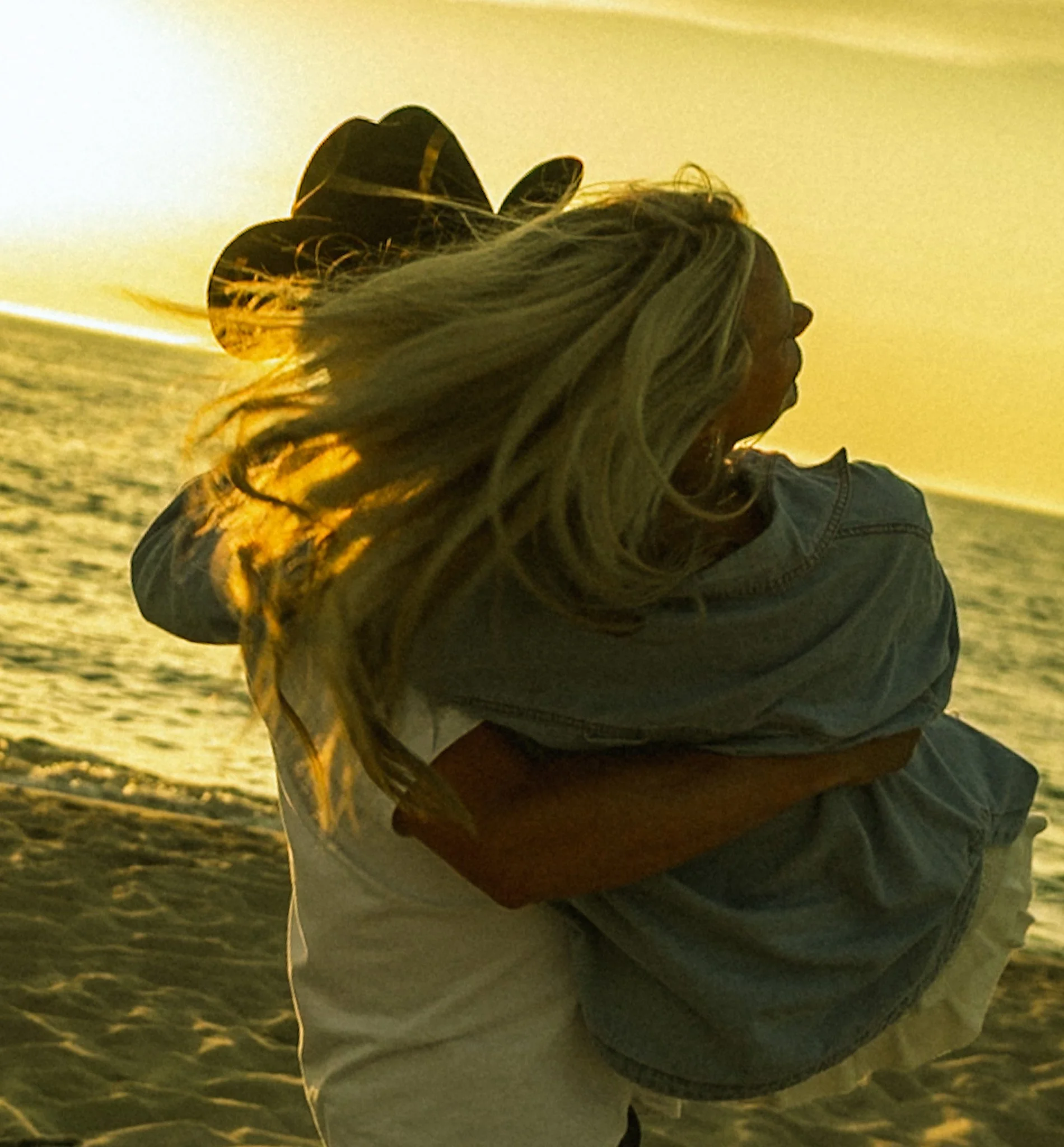 A person with long blonde hair hugging another person on the beach during sunset, with the ocean in the background.