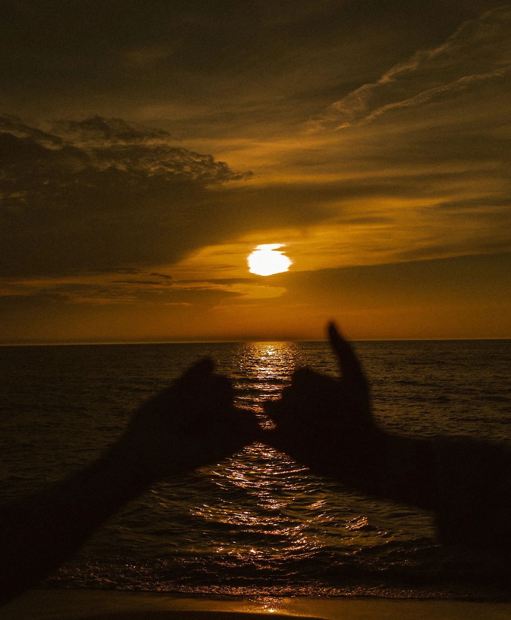 Silhouette of two hands creating heart shapes in front of a sunset over the ocean