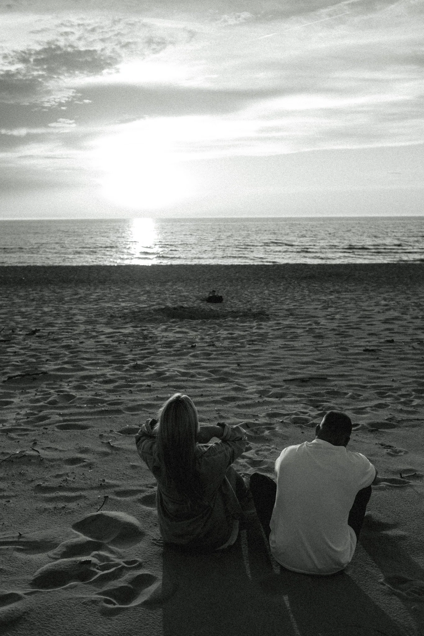 Two people sitting on the sand facing the ocean during sunset, with the sun near the horizon and reflected on the water, in black and white.