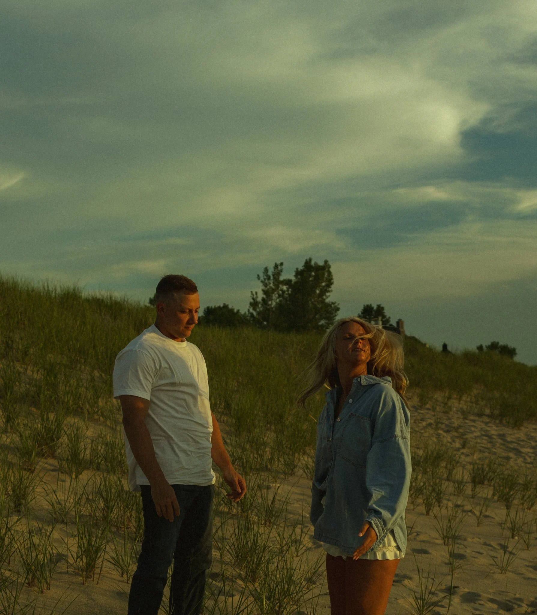 A young man and woman standing on a sandy dune with grass under a cloudy sky, both looking pensively into the distance. The woman has long blonde hair and is wearing a denim jacket and shorts, while the man has short hair and is wearing a white t-shi